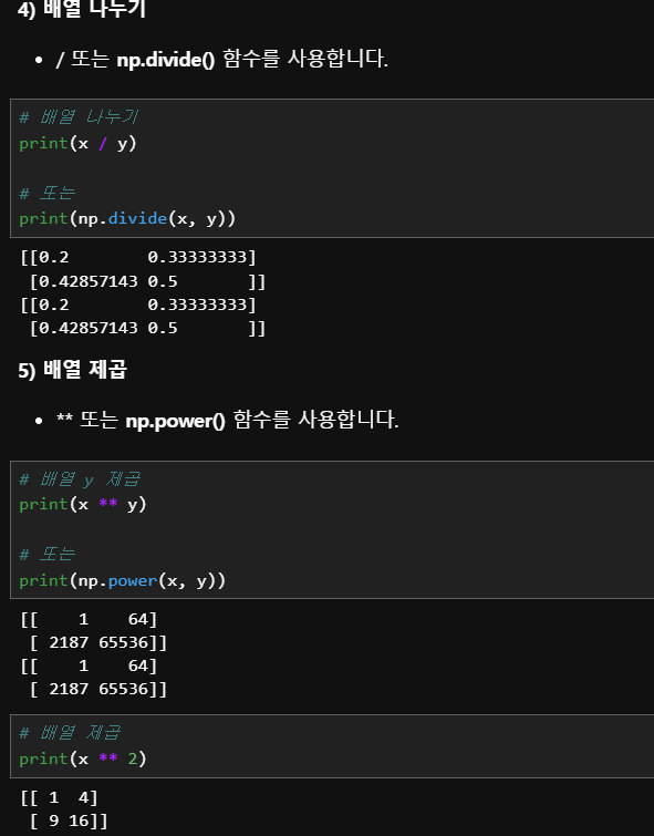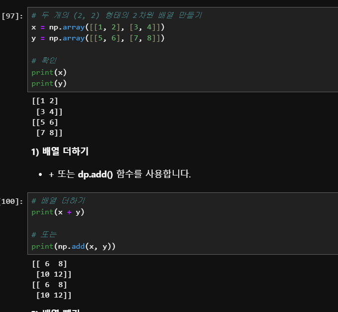 위 예시는 두 개의 (2, 2) shape의 배열 연산이다. 결과는 사진을 참고하면 좋겠다.