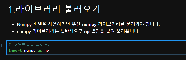 "import numpy as np", 기억하자. 이는 numpy 라이브러리를 불러와서 np라는 별칭으로 사용한다는 뜻이다. 물론, np라는 별칭 외에 다른 것으로 사용해도 되지만, 일종의 굳어진 사회적 함의이므로 최대한 위와 같은 별칭을 사용하도록 하자.