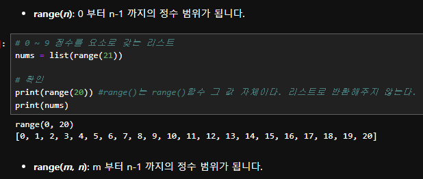 range(m, n)과 같이 사용하면, m부터 n-1까지의 정수 범위가 되게 한다.