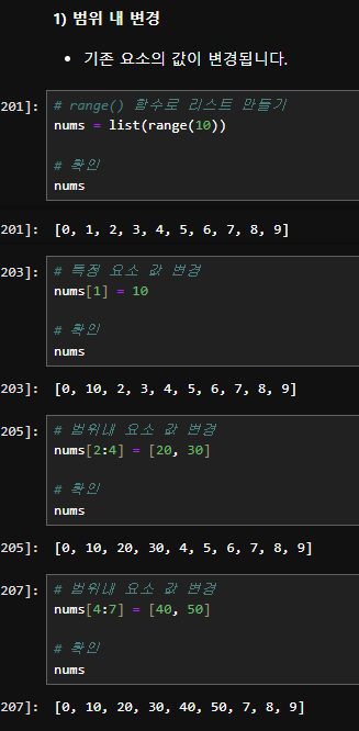 앞서 말했다시피, 리스트 자료형은 mutable하다. 즉 리스트 안에 있는 요소의 값을 변경이 가능하다. 이는 리스트 명을 입력후, 변경할 인덱스 번호를 입력, 혹은 구간을 지정한 뒤, 해당 값에 들어갈 값을 입력하면 된다. 예시를 살펴보면, nums[1] =10의 결과 인덱스 1번의 값이 10으로 변경되었고, nums[2:4] = [20, 30]으로 인덱스 2번에서 3번의 값이 20, 30으로 변경되었고, nums[4:7] = [40, 50]으로 인덱스, 4~6번의 값이 40, 50, (none)으로 된 것을 볼 수 있다. 값은 지정하지 않은 인덱스 6번의 값이 아예 사라진 것을 확인할 수 있다.