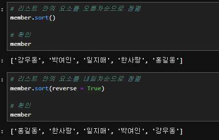 다음은 sort()이다. 이는 정렬을 의미하는데, 기본적으로는 오름차순으로 리스트를 정렬한다. 그러나 sort(reverse = True)로 설정하게 되면, 리스트를 내림차순(오름차순의 역순)으로 위치하게 한다.